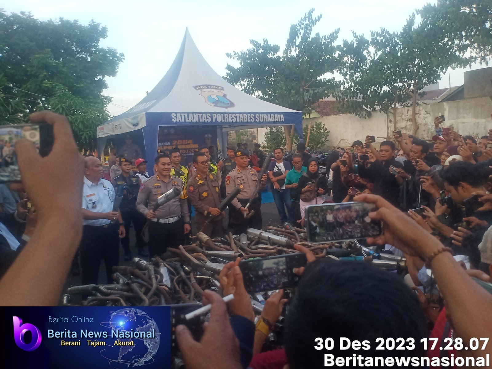 Surabaya - beritanewsnasional.com - Satlantas Polrestabes Surabaya memusnahkan knalpot brong karena menjelang perayaan tahun Baru 2024 di Satpas Colombo. Pada hari Sabtu 30 Desember 2023 sekira jam 15.30 WIB.