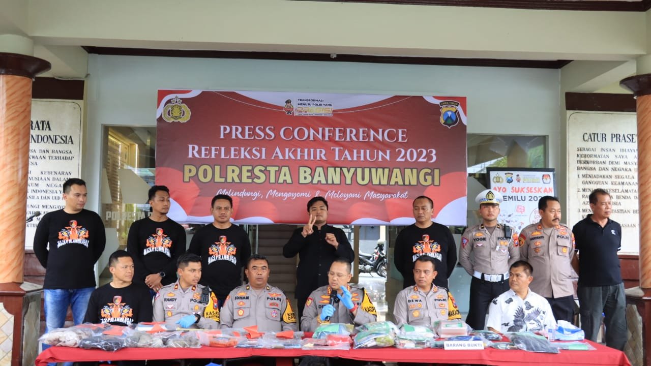 Dengan didampingi Wakapolresta Banyuwangi, AKBP Dewa Putu Eka Darmawan, beserta seluruh Pejabat Utama (PJU) Polresta Banyuwangi, semua tersangka dan barang bukti (BB) dipampang dalam Press Conference Refleksi Akhir Tahun 2023.