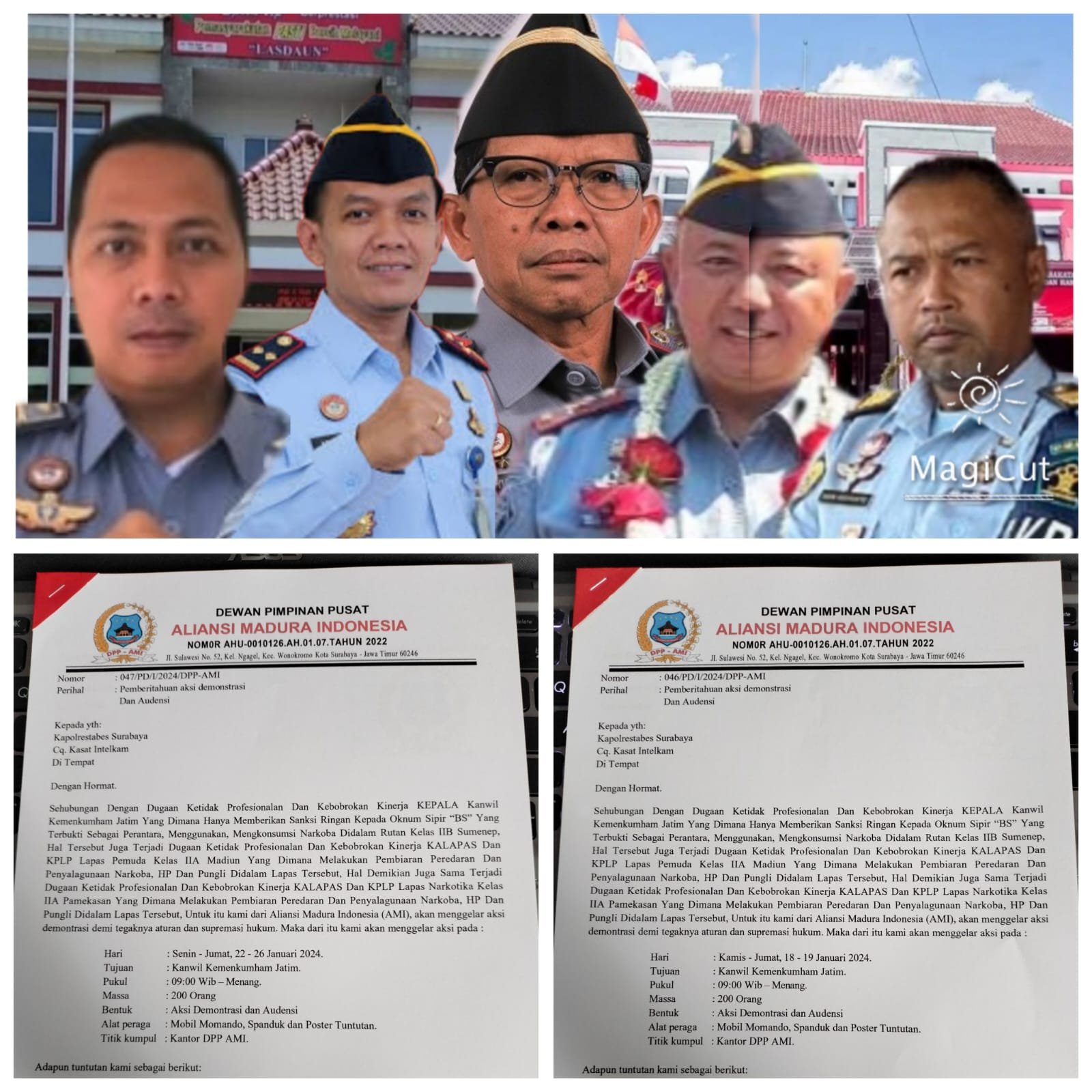 Surabaya, - beritanewsnasional.com - Lambannya penanganan Kantor Wilayah Kementerian Hukum dan Ham Jawa Timur untuk menangani persoalan kasus masuknya peredaran Narkoba, HP dan Pungli yang berada di Lapas Pemuda Klas II A Madiun dan Lapas Narkotika Klas IIA Pamekasan, membuat Aliansi Madura Indonesia (AMI) memprediksi adanya dugaan main mata.