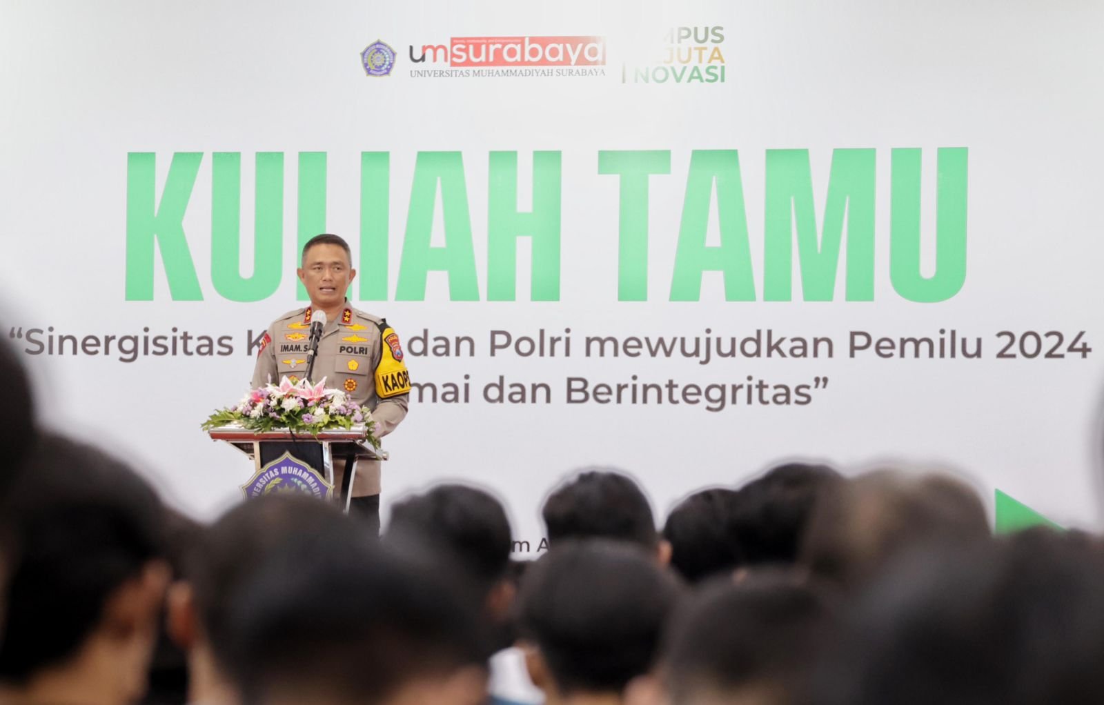 Surabaya - beritanewsnasional.com - Kapolda Jatim Irjen. Pol. Drs. Imam Sugianto, M.Si., mengajak civitas akademika Universitas Muhammadiyah Surabaya untuk mewujudkan Pemilihan Umum (Pemilu) 2024 damai. Hal tersebut disampaikan Kapolda saat memberikan kuliah umum ke mahasiswa UM Surabaya.