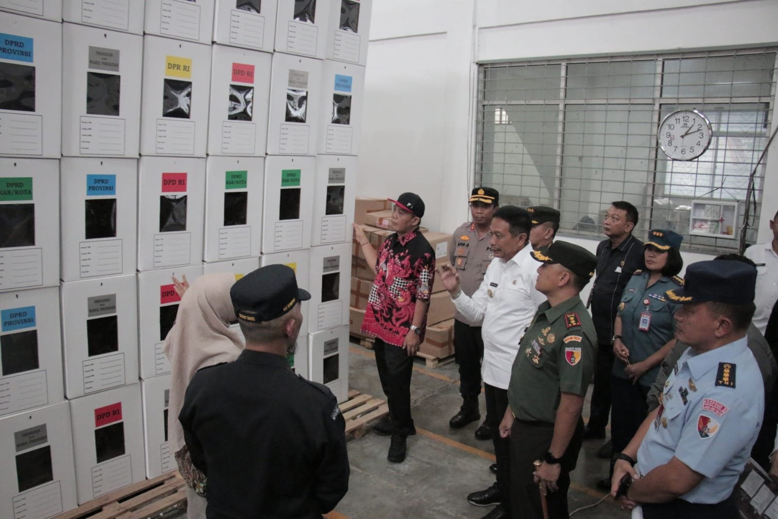 Rombongan Forkopimda melakukan pengecekan kesiapan logistik seperti bilik suara, surat suara dan ketersediaan sarana lainnya pendukung Pemilu 2024 hingga mengevaluasi sistem pengamanan gudang.