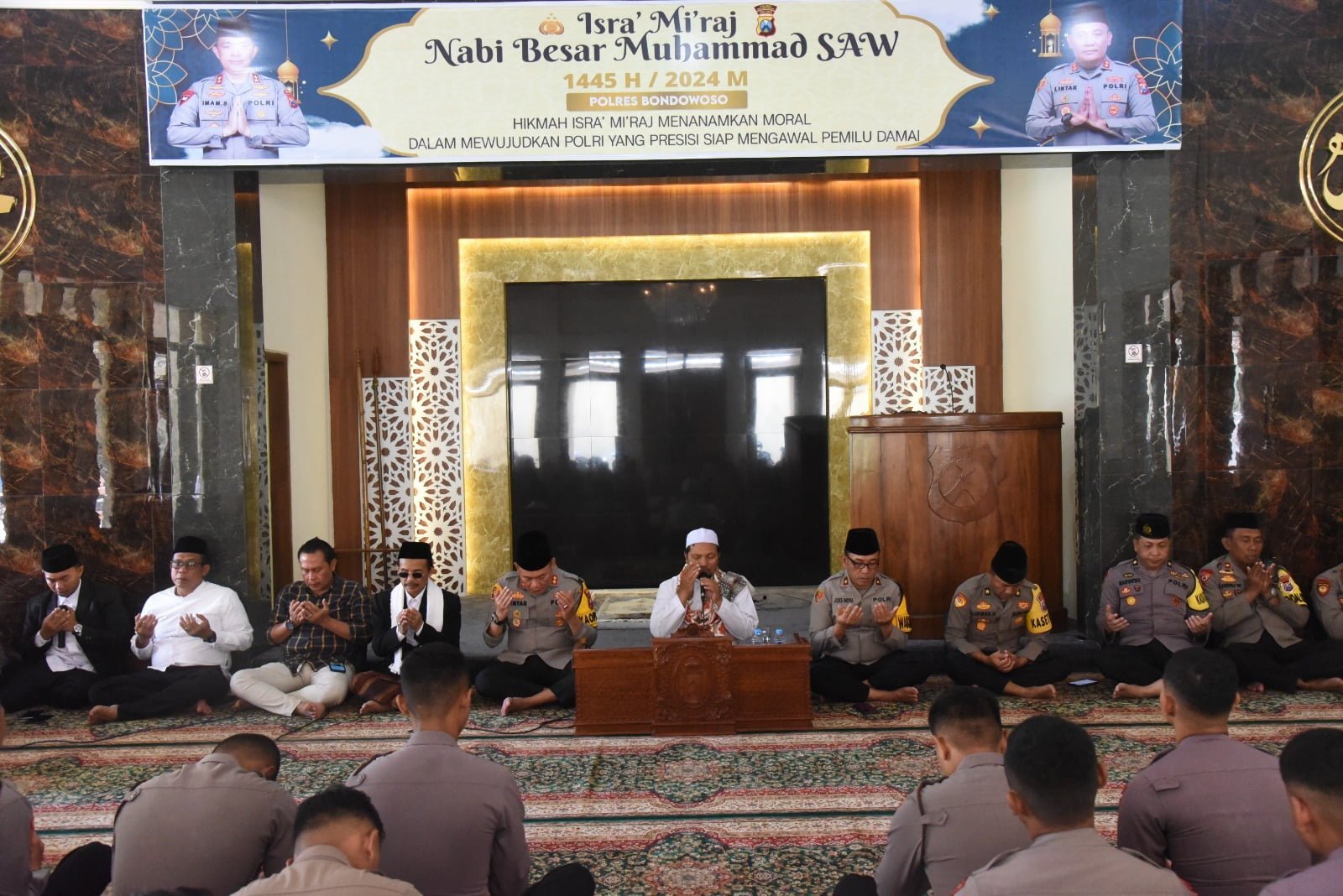 Dengan tema Hikmah Isra Mi’raj menanamkan moral dalam mewujudkan Polri Presisi siap mengawal Pemilu 2024 Damai.