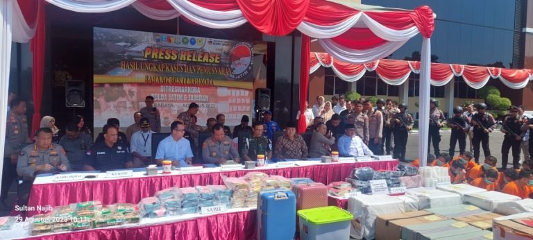 Pemusnahan barang bukti berlangsung di Mapolda Jatim, ini sebanyak 19,668 kg sabu dan 3.888 butir ekstasi. Giat pemusnahan dihadiri antara lain Kapolda Jatim Irjen Toni Harmanto, Kejaksaan Tinggi, BNNP Jatim dan pejabat Utama Polda Jatim diantaranya Dirresnarkoba Polda Jatim Kombes Arie Ardian.