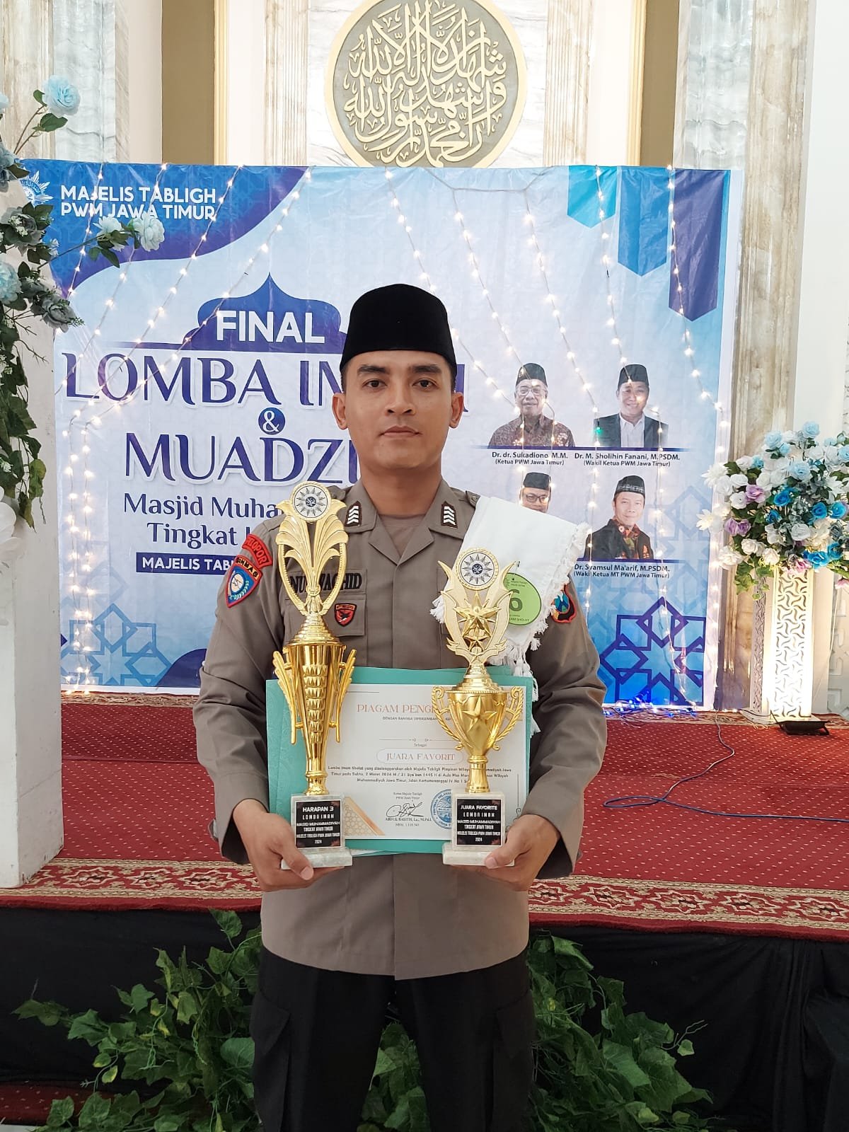 "Kami ucapkan selamat kepada Bripka Nur Wachid atas apa yang sudah dicapainya dari masuk 10 besar sampai mendapatkan juara Favorit dan Harapan 3 dalam Lomba Imam Masjid yang digelar Majelis Tabligh Pimpinan Wilayah Muhammadiyah (PWM) Jatim, "ungkap Kapolres Lintar.