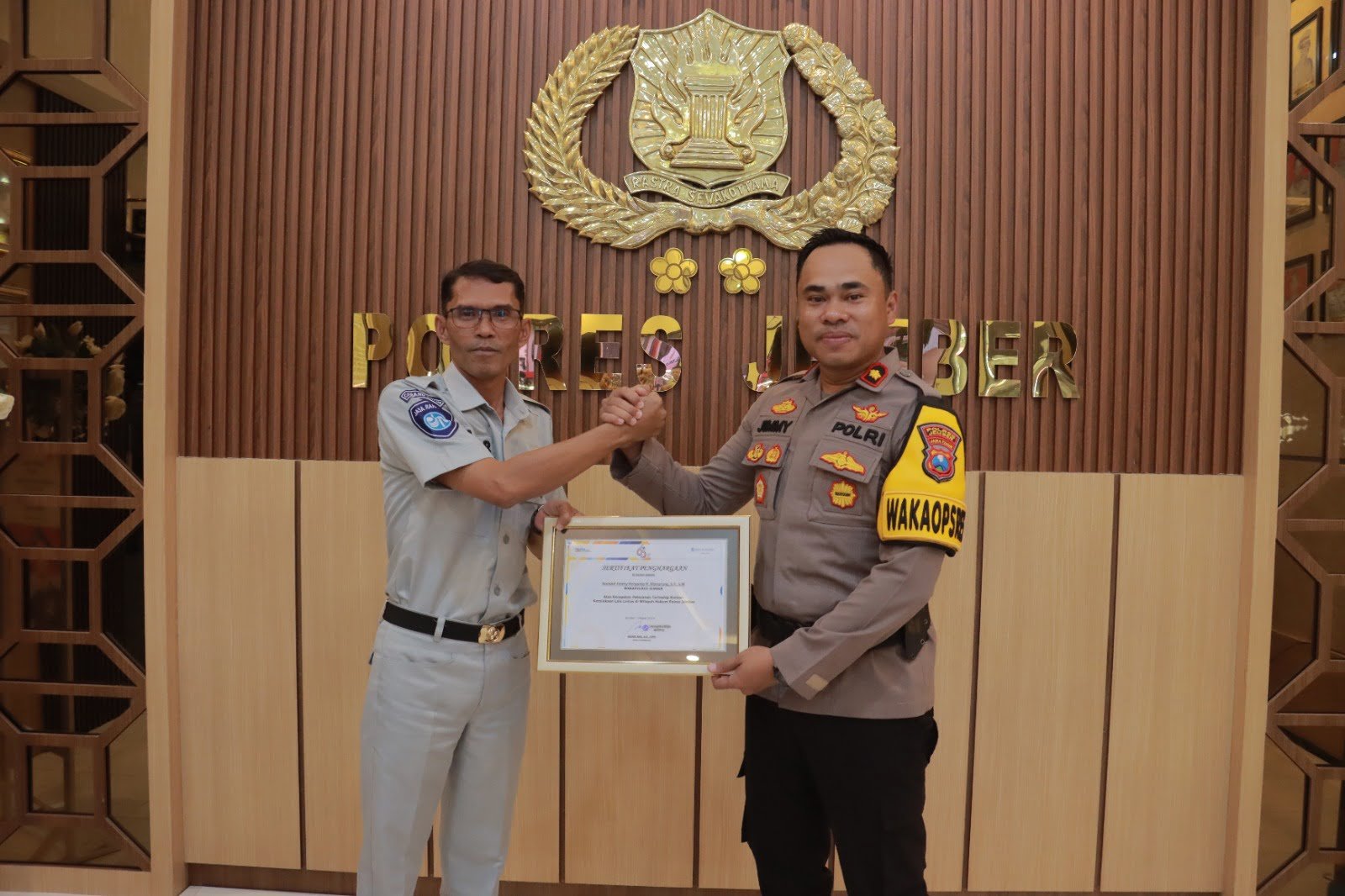 Piagam penghargaan diserahkan langsung oleh Kepala Perwakilan Jasa Raharja Jember, Abdul Bar, S.E., AWP, dan diterima oleh Wakapolres Jember, Kompol Jimmy Heryanto Hasiholan SH SIK di lobbi Polres Jember, Sabtu ( 2/3/2024).