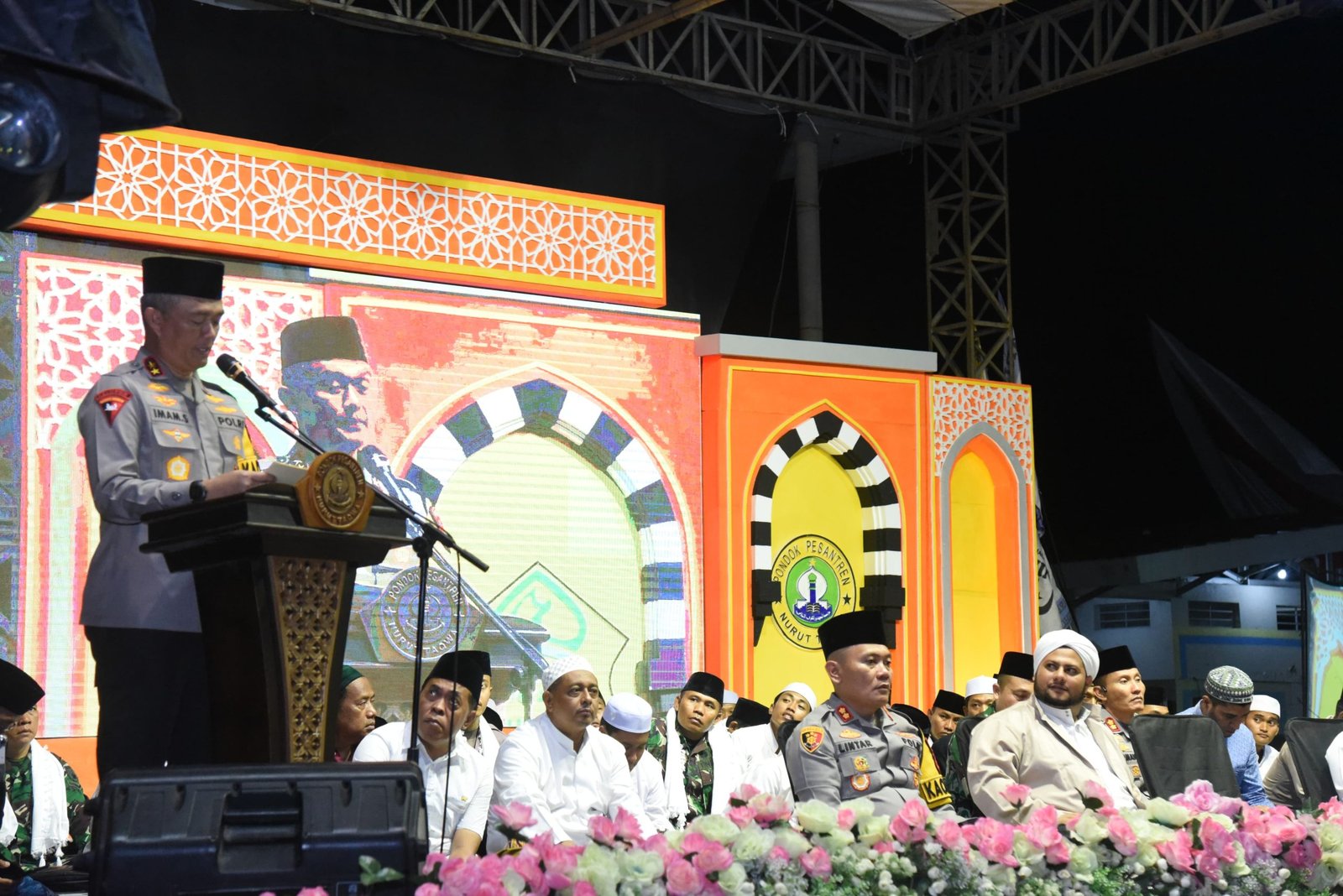 Selanjutnya Kapolda Jatim Irjen Pol. Drs. Imam Sugianto, M. Si menyampaikan permohonan doa restu kepada para alim ulama untuk tetap bisa menjaga persatuan dan kesatuan NKRI serta beraneka ragam seni budaya dan juga kepercayaan dalam beragama.