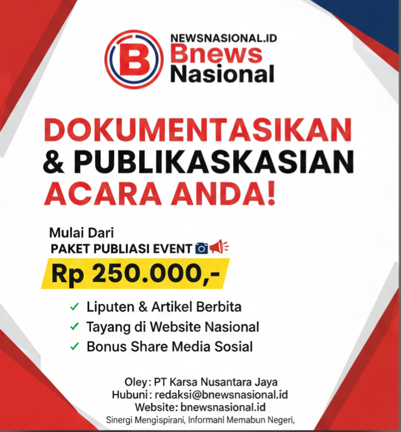 Bnews Nasional di bawah naungan PT Karsa Nusantara Jaya memberikan ruang bagi Anda untuk mempromosikan kegiatan, produk, maupun jasa dengan jangkauan nasional yang luas dan terpercaya.